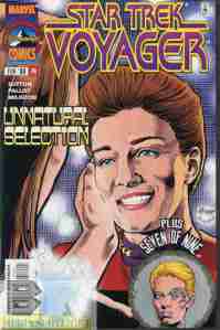 After setting up that this is the point in the show where Kes leaves and Seven Of Nine enters (apparently balancing the loss of Kes–sucks to be all those others who have died on this mission), the story proper begins. Voyager receives a distress call and the naked woman called Caitra, with sparkles covering her girl bits, immediately entrances the men on the bridge. However, learning that the captain is female she defers to her brother, Katirus, who has a similar sparkle cover over his guy bits and has a similar effect on the women, including Janeway. The only woman not affected is Seven Of Nine (start your fanfic now because it gets explained next issue), who is later attacked. The same energy is found in Torres’ brain when she’s attacked by Katirus (thorugh the deadly weapon of kissing) while trying to fix the ship. Janeway, also enthralled with the near naked man, goes to his ship, clearly under his influence. Tuvok sneaks onboard only to be attacked by Caitra the same way Katirus did with Torres.
