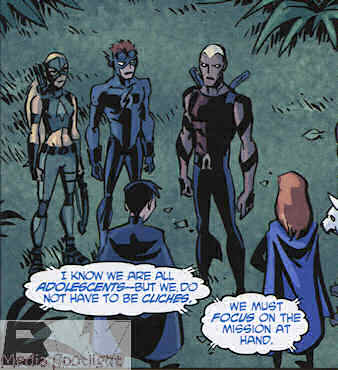 The comic tie-in to Young Justice tried to follow the show’s example of having the letters for location and time on the panel the way it would on the screen. It only really works if you already know the show because there are only four ways lettering doesn’t look weird on a comic panel: dialog, narration, sound effects, or in-world lettering. Each developed it’s own way of doing their job. Those on-panel letters, and I’ve seen this done in comics that aren’t try to resemble a show, movie, or video game scene, just don’t have the same form in a comic book. I know comics are trying to be more like TV and movies because the creators don’t have the same trust in their own format and want to be more like the “cool kids” but comics need to be comics. Putting that in a narration box just looks better and confirms this is not in-world audio or lettering. Otherwise it again pulls me out of the story because the literacy of comics is being violated.