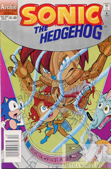 The main story introduces Dulcy the dragon, a character from the ABC Saturday Morning Sonic The Hedgehog cartoon. While on patrol with Sonic, the pair force a hovercraft to crash and find a de-roboticizer with enough juice for one use. Bunnie comes up with a plan to have one of them get roboticized to infiltrate Robotnik’s base, and Sally volunteers herself. However, a device that would protect her mind gets lost and she ends up in Robotnik’s control, trapping the whole gang except Dulcy, who uses the device to restore Sally to flesh and fur so our heroes can escape.
