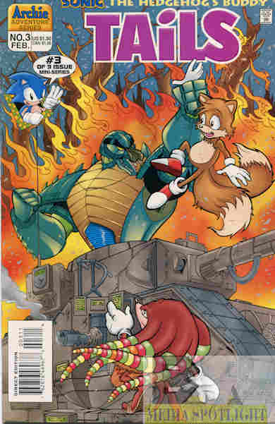 Learning that he’s the crater that once held what is now the Floating Island, Tails is give the story of the arrival of the Chaos Emeralds on prehistoric Mobius, and that he has a destiny attached to them, by the Ancient Walkers. Meanwhile the Downunda Freedom Fighters manage to destroy the CD Rom Ram of Crocbot, but not before Barby is knocked into the crater, where she recruits Tails to stop the blimp’s arrival. Tails and Barby take on Crocbot and manage to force the blimp to crash, also saving Wombat Stu. Crocbot escapes in his tank, but even Guru Emu is sick of him and sends one of Walt’s exploding boomerangs as a good-bye gift, damaging the tank. Now cooled off, Tails wonders if he can return home, when the Forty Fathoms Freedom Fighters arrive with a repaired Sea Fox. So Tails heads home to tell his friends that they aren’t the only Freedom Fighters on Mobius.