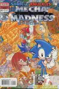 In the main comic Sonic has been captured by Nack The Weasel and delivered to Sonic to be shoved into the Roboticizer. This is after Sally rejected Sonic’s plan to let himself be roboticized with a device to keep his free will, which of course he didn’t have on him. So the “Mecha-Sonic” attacked Knothole, leading to our main story in this comic. In order to stop Mecha-Sonic Sally is forced to follow Sonic’s plan but turning Knuckles into Mecha-Knuckles. The battle is even, with Knuckles being fresher in batter being his only advantage. But when Robotnik orders Mecha-Sonic to blast Tails the real Sonic’s personality puts up a fight and when both robots are sent flying into Robotropolis Sonic takes the blast meant for Knuckles, who brings the damaged hero back to be deroboticized along with himself. Back to normal thanks to previous issue stuff Sonic doesn’t remember what happened during his time as a robot but, believing he got himself roboticized on purpose, Sonic is arrested.