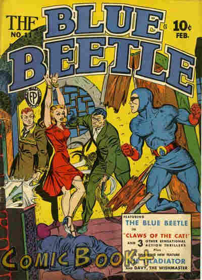 - “Claws Of The Cat”: I guess we’re getting titles for every story without using the Grand Comics Database. If so, it’s about time. An attempted jewel robbery goes wrong thanks to Joan snapping a picture and distracting them long enough for Blue Beetle to distract them with his skull (dude gets knocked out more times than Hal Jordan, but Hal isn’t wearing a helmet) until the police arrive. One of the crooks at the next attempt tries to snag the jewel for himself but is killed by claws. Joan gets that picture too so “The Cat” comes for her. It’s just a dude with a metal three-pronged claw for a hand. It’s not very impressive, Mike gets to be a hero and still manages to be the butt of the joke, and the layout needs work for better reading. It’s kind of meh when it’s all over. Also, how does Joan know that Dr. Franz can contact the Blue Beetle?