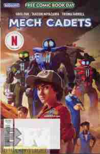What I believe is a sample from the first volume of Mech Cadet Yu, a graphic novel series (or trade collection, I’m not sure which) that is about to be turned into a TV series by Netflix, though YouTube didn’t bring up so much as a teaser for it as of this writing. Years ago a boy named Skip Tanaka made contact with and befriended a giant robot from outer space, known as a Robo Mech, and defeated an alien invasion. 60 years later and every few years cadets from Sky Corps carry on the tradition as new robots visit. This includes one ego-driven girl named Park is sure she’ll be one of the next pilots, a personal favorite of the general in charge. However, one of the new robots is found damaged by a janitor’s son, Yu Stamford. The boy’s kindness and love of robots wins the blue Robo Mech despite the strong objections of the Corps until they’re bailed out by Tanaka himself. The general’s protogé however is chosen to pilot the first Earth-built Robo Mech as compensation.