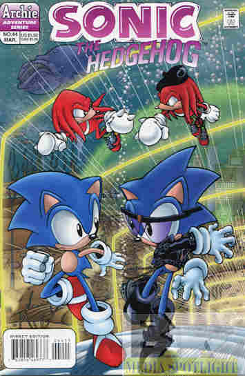 The Sonic from the “mirror universe” attacks Knuckles along with a version of Knuckles from his world, where he’s guardian not of the Floating Island but the Sunken Island. Also, he’s Irish instead of Australian. Our Sonic and friends joins Knuckles in tracking them back to the other dimension over the Cosmic Interstate and learn that “evil Sonic” was actually working with Robotnik for a piece of the action, that action being the use of the Sunken Island’s Chaos Emerald, which keeps an air bubble around the island, as well as alt Mobius for testing. Robotnik betrays him (of course) but the others work together to send Robotnik away.