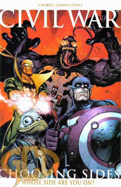 Choosing Sides is a one-shot set during that period, cover dated December, 2006. The comic features four Marvel heroes–Iron Fist, Venom, US Agent John Walker, and for some reason Howard The Duck, who you’d think would be the least connected to these events. Venom doesn’t have a secret identity and is a villain or at best anti-hero, I don’t know if John Walker was exposed as US Agent or one of the many former Captains America, and I don’t know that Iron Fist every bothered with a secret identity. At any rate Howard wouldn’t have to register with the Superhuman Registration Act because he isn’t a human and I doubt SHIELD would want to draft him into anything. Even ICE isn’t looking for him because he technically wasn’t an immigrant to 616; he was forced here.