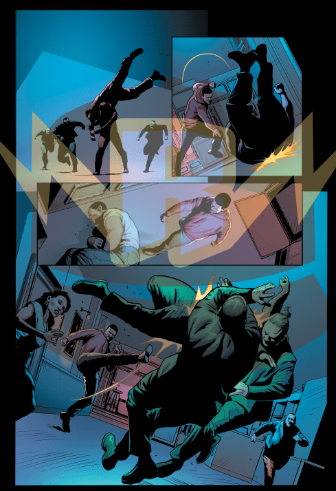 For one thing, Isom #1 isn’t just the first volume of this series. It’s the opener for the entire Rippaverse, and that may be one of the story’s biggest missteps. That’s why the Yaira and Alphacore stuff are there, to set up the expanded universe. Perhaps July didn’t need Isom actually confronting them but they could have been mentioned on the news or something similar, something to show that other “Excepts” (his version of the metahuman or mutant, possibly standing for “exceptional” or as July referred to them, “special people” like the Ultras of Malibu’s Ultraverse) exist without actually showing Avery dealing with them when he has his own concerns. It might have been better to do some kind of “preview” story prior to this, something cheaper if he doesn’t want to go with free, showing the early concepts of the Excepts. Perhaps frame it as reports the Alphacore has on Isom and Yaira as well as their own team and hints of the strange robed character from the oversized trading cards we only know as Dokumaan without any idea who or what he is.