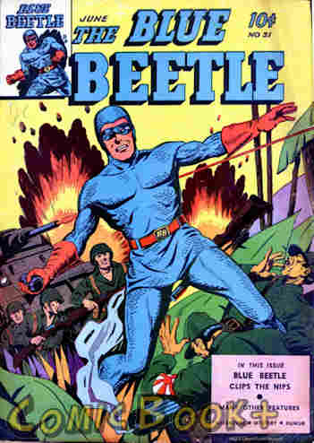 Okay, if you’re for some reason reading the reviews first, this one is seriously propaganda. I’m thinking Fox couldn’t get the old writers back and the Grand Comics Database suggestions on who the creators might be back that up. (They don’t know for certain so I’m not listing them.) This time Dan and a colonel deliver a set of dispatches but Nazi spies in the FBI forces them to crash onto an island run by the Japanese, so Blue Beetle has to save them. Luckily the US army is about to invade the place. As a story it’s an improvement but this story does not age well, a problem for any form of propaganda really.