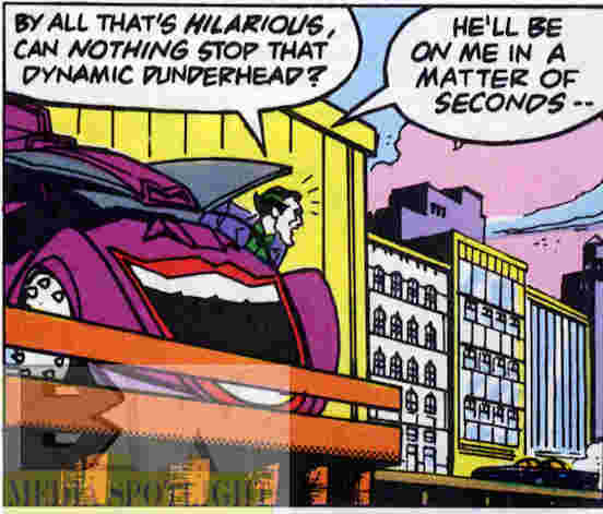 After using the toys cars’ battering rams to bust through a totally abandoned building wink wink, the Joker finds himself on the docks but his car (called a van in one panel) has a submarine mode, which puts him one up on Inspector Gadget. So he drives into the drink only to get caught by Aquaman as he and Batman were apparently ready with a plan to steer the Joker here and get caught. Maybe they DID know about the robbery beforehand? We only saw this story from the Joker’s perspective.