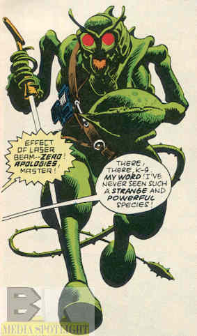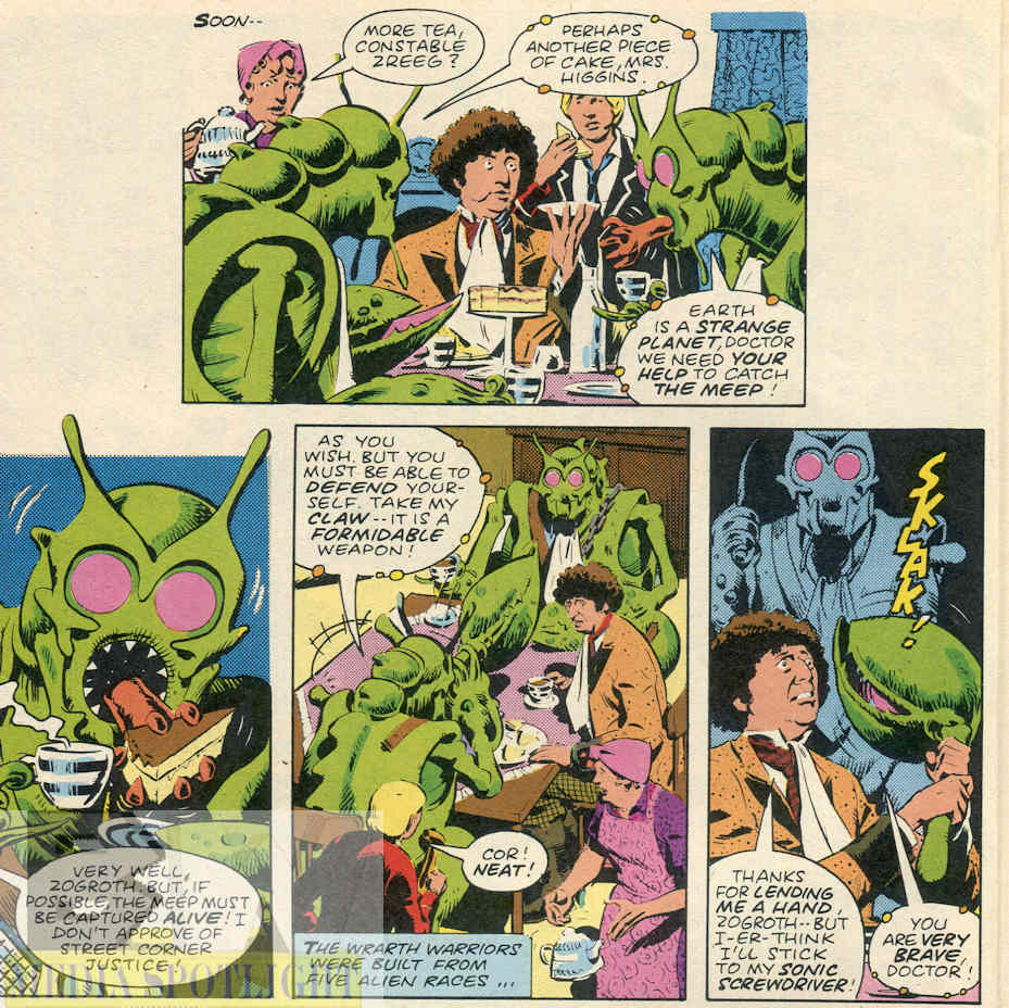 Also what works dividing here is that issue 2 of the US comic (issue 22 of the magazine) is where we finally get Beep talking as he tells his story, so there’s no reveal in issue #1, making for a better twist in the telling. The Wrarth Warriors want him dead, having attacked his planet and destroyed the rest of his race, or that’s his story anyway. Fudge’s mom notices the Wrarth are in her rhubarb patch so the Doctor builds a device that uses ultra white light to mess with the Wrarth’s infra-red vision. The comic version of the Fourth Doctor was space MacGyver. We also get to “hear” the Meep’s thoughts, and…his thoughts are not so pure, annoyed about how Sharon is treating him like a puppy instead of the “most high”.