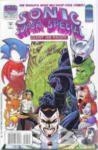 A woman named Particle arrives in Mobotropolis, knocking out the investigating Freedom Fighters before warping to the Floating Island and stealing the Chaos Emerald with Mammoth Mogul still trapped in it. She manages to take out Knuckles with her stun power, and we wakes up to the island in the water. (You’d think that all the times that thing has hit the water they’d find a way to make the Island float the next time.) Our heroes journey to a version of Earth set in the Image universe. There they team with the then-current incarnation of Shadowhawk, a teen wearing the armor, The Savage Dragon (hadn’t he stopped being a cop by this point except in the cartoon?), and Union, but they’re all taken down by a mysterious enemy who knows Sonic and has an army of SWATBots. In there, Particle rescues her sister as well as the heroes and Velocity while The Maxx shows up in the villain’s train…somehow. Long story short, our heroes take the Chaos Emerald back and leave a confused pair of FBI agents behind them.