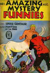 I looked up that “Masked Marvel” and it’s just a guy in a mask who fights crime, like the Inner Circle but with odd fashion choices. So Keen Mystery Funnies didn’t impress me. Also, possibly for rights reasons, some of the comics at Comic Book Plus from around this time have stories missing, most notably Tarzan, Dick Tracy, and Little Orphan Annie, who apparently made their way into a lot of these compilation comic books. I’m not going to review an incomplete comic, so this is going to be easier than I thought for a while. Some of what they have in the virtual newsstands are text magazines, and I don’t even review the text stories in the comics. Give them a read sometime if your curious, but we’re getting on with this series. It has a crimefighting centaur.