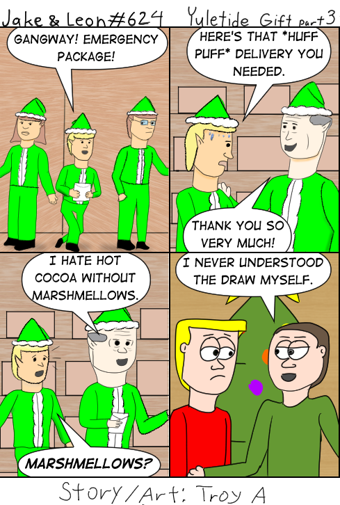 Not being able to get a Captain Yuletide done this year, and needing a story for this year’s Jake & Leon Christmas story, things came together for me. At least I get to draw the elves. I even grabbed the unnamed elf from the first issue of Captain Yuletide that just chides Mitch for liking robots, and finally gave him a name (say hi to Mort) since I finally named those two guys from the comic store. This time he’s bothering poor Zek. There will be one more next week.