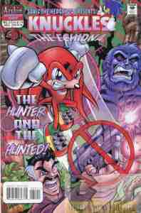 In the main story, the Overlander reveals himself, but not his name. The captions call him “the Hunter”, and that’s what we’re going with. He takes Knuckles and Monk prisoner. The Hunter has been learning all he can about Knuckles and the Guardians, setting up a device that interferes with their external sensors. Threatening to go after Julie-Su if he doesn’t cooperate, he forces Knuckles to put collars on himself and Monk. If they go too far apart they’ll shock both of them. He then sets them loose so the hunt can begin.