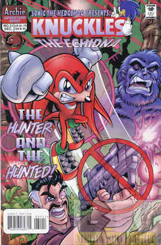 In the main story, the Overlander reveals himself, but not his name. The captions call him “the Hunter”, and that’s what we’re going with. He takes Knuckles and Monk prisoner. The Hunter has been learning all he can about Knuckles and the Guardians, setting up a device that interferes with their external sensors. Threatening to go after Julie-Su if he doesn’t cooperate, he forces Knuckles to put collars on himself and Monk. If they go too far apart they’ll shock both of them. He then sets them loose so the hunt can begin.