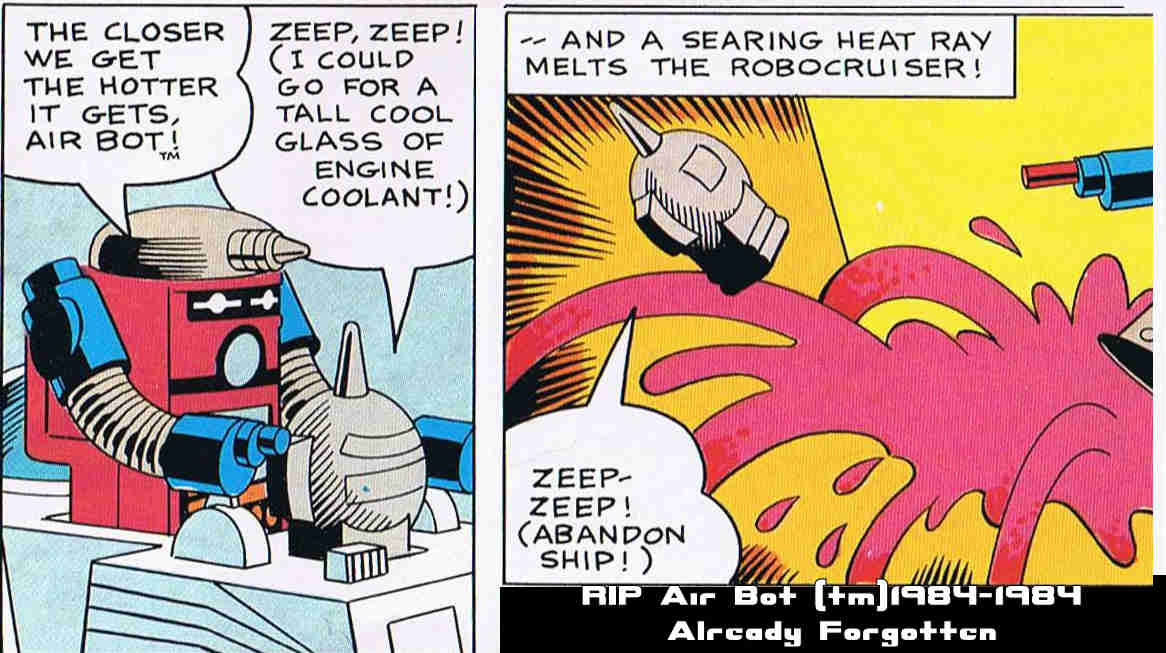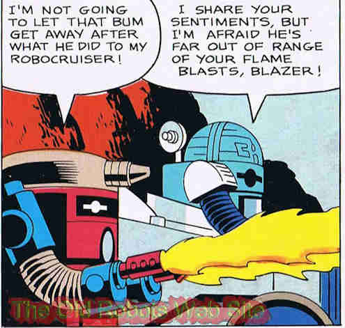 Hun-Dred is the robot responsible for the rise in temperatures and he doesn’t want to be found out or stopped. His goal is to change the climate of the whole planet, Zeton. (The new cartoon seems to be taking place on Earth. What happened to alien worlds? With aliens? Okay, I guess THEY wouldn’t b…you know what I mean!) Hun-Dred blasts the Robo-Cruiser with the heat ray he’s using to actually cause global warming, meaning we won’t be showing off it’s cool neat features except for the Air-Bot that ejects with Blazer and then will never be mentioned again despite pointing him out in two of the three panels the ship was in. Hun-Dred’s “Dred Crawler” has one, too, but we never get shown it.