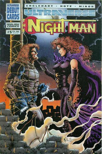 The Night Man encounters Briggs and an officer investigating a murder whose MO matches Rhiannon, aka Rita Diamond. The back and forth is really an excuse for him to record the crime scene to view later via his lens. He also talks to Rita’s fiance, who clearly is under the same spell The Night Man himself is trying to fight off. Clues lead to her new base of operations, where she tries to convince him that she actually has fallen for him, that the murders keep her alive thanks to something her priestess mom did back in the early 1900s (possibly late 1800 since we see she was 21 back 1908 or at least claiming to be). In the end, our hero must let her fall to her death.