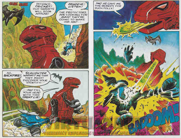 Using his unintentional cover story to his advantage, Backfire/Scooter tells them of his escape and that he spotted a battlestation (which is of course in the area where the trap is supposed to be sprung). He’s rather surprised at how Scooter’s friends treat him, something Backfire doesn’t get from his allies, in part because he lives up to his name and screws up a lot. This leads to him questioning his trick the next morning as Hotshot leads the group to the destination where they think the battlestation is and Deadeye is waiting for them. “Scooter” and Crank are damaged so they stay behind until Crank tells his allegedly memoryless friend about the battlestation and sleeping Man. Realizing how big a mistake he made, Backfire tries to stop them, but with Scooter’s axle damaged he can’t get there fast enough. He tries instead to tell Deadeye what’s really going on.