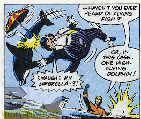 If you don’t think that’s cool, you’re one of those people who tried to shut down aquariums and performing animal shows. Could you get a dolphin to do this? By the way, dolphins are not fish. Aquaman’s power besides breathing underwater is to command sea life (or just talk to them if the writer is an animal lover or can get a gag out of it). If someone were chasing me on dolphins with a large trident I would not be casual about it. I am not the Penguin, though. I also don’t have an umbrella that shoots little umbrellas. I wouldn’t want one, but again, I’m not the Penguin.