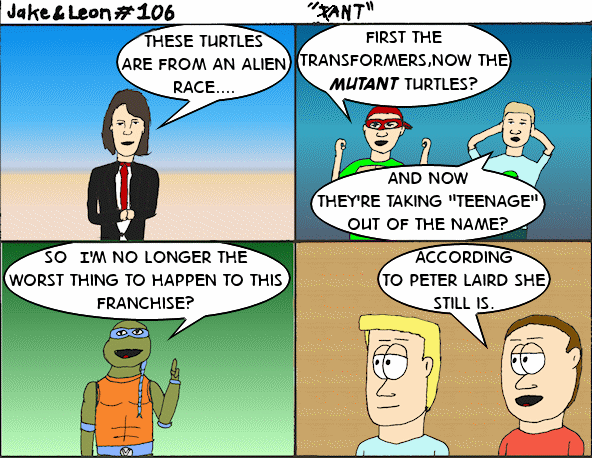 This is something that Michael Bay actually said when promoting his Ninja Turtles movie. The second panel is the fan reaction, obviously. The female Turtle is Venus, Saban’s addition in Ninja Turtles: The Next Mutation. Fans don’t like her. TMNT co-creator Peter Laird, in defending Bay (while admitting he wasn’t happy with the change) still declared Venus a worse idea because he never liked the fifth turtle idea. After reading his comments, I kind of understand why he thinks that but I disagree, if only because I’m so tired of Hollywood changing everything about a license lately that any major deviation gets to me.