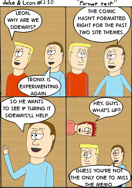 In the archives it comes out fine, but in the blog pages the image would get squashed down and messed up the text slightly. Sure, if you clicked through to the archive page you could read it just fine, but how often does that happen? It’s mostly there so I can find a comic quickly. I don’t think anyone else uses it. So I’m hoping that putting it this way will work better.