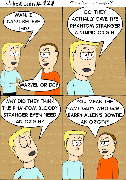 Unless they were joking I have heard Phantom Stranger’s origin, and it’s not only stupid it may well be religiously insensitive. I know as a follower of the Bible I don’t care to see it used like some kind of Greek myth. Not that you can’t play with historical figures, mind you, but it still feels wrong.