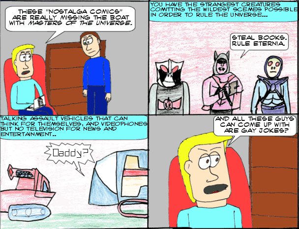 I’m getting close to finding the right size, and it’s only taken me 12 comics so far. 😛 Anyway, I wanted to make the explanation panels different from the usual Jake & Leon style (can you imagine Skeletor in that style, because I can’t). So I inked it using the wrong shade brush pen I have and colored in with coloring pencils rather than the computer colors I usually use. In later comics, I may show that Jake is a cartoonist and this is an example of what things he draws will look like.