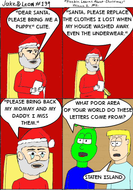 The letter in panel 2 comes from an actual request I heard on the radio. One of Santa’s Helpers was looking over some of the letters from kids and kids who survived “Superstorm” Sandy were asking for underwear, food, and a new house instead of a Wii U or toys. According to the news report he had to stop reading all the requests at some point because it was breaking his heart. That inspired this strip.