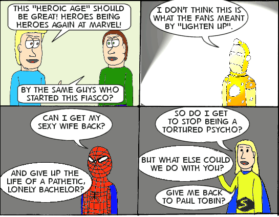 Yeah, after I did my commentary/parody of “Blackest Night” I figured why not do the same for Marvel’s “Heroic Age” announcement? I didn’t add that Sentry is also supposed to be on drugs as a power source because I figure murdering nutjob is bad enough. I’m wondering if I should have had Spidey upside down, but the body types are still close to the usual style I use for the comic, and this style doesn’t respond well to major posing, in case you hadn’t noticed. 😦