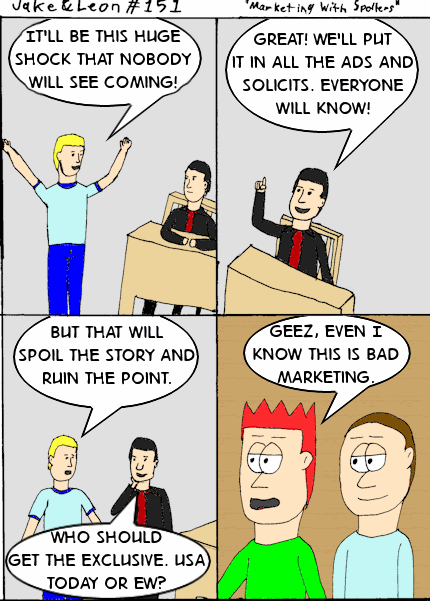 This happens a lot in comics, movie, and television. Some writer comes up with this surprise moment which (in theory) will make for a great storytelling moment, but only if the reader/viewer doesn’t see it coming. So naturally the marketing includes the moment as a hook to get people to read or watch it, thus ruining it’s potential and ruining the story. Worse is Japan, who often spoils stuff right in their title. It shows how little marketing people really understand storytelling.