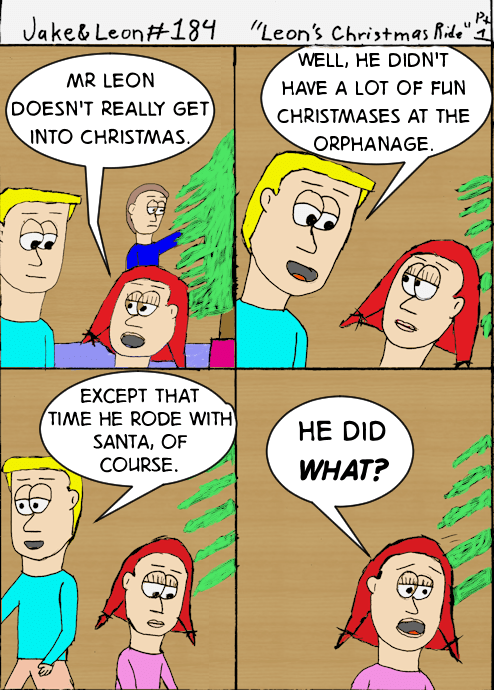 I realized that while we know a few things about Jake (being a cartoonist, having a brother named Leroy) w know nothing about Leon, including stuff in my head. For example, that Leon is a local boy and grew up in an orphanage. It wasn’t a bad orphanage but when you get passed over and spend every Christmas there it might dampen your spirits a bit. it may or may not also explain why Leon is the more cynical of our two hosts.