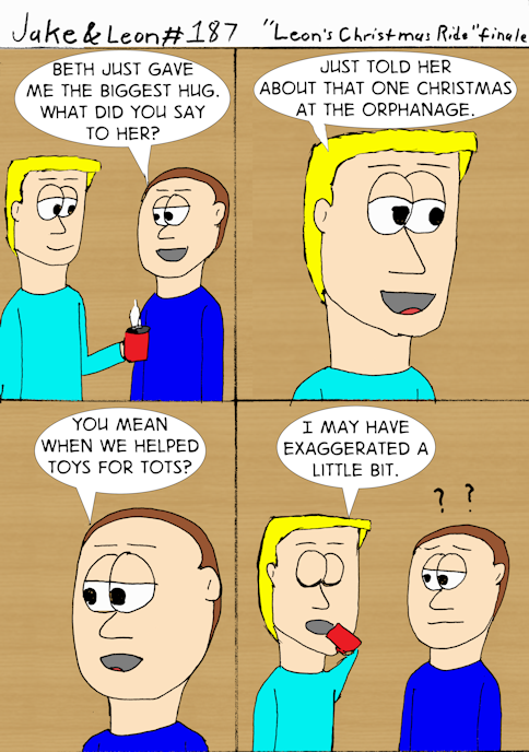 I know it’s weird when there’s an alien in a cast and an interdimensional being that drops by to promote the latest superhero webcomic crossover he’s involved in, but having Leon ride with the real Santa Claus because he picks a good kid every year to ride with him seemed off. Or maybe I just didn’t have another way to end the comic. Either one.