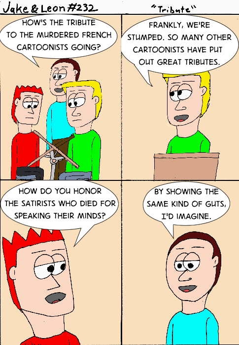 Around this time French satirists who spoke out against attack by fanatic Muslim groups were attacked and killed in their own offices. Cartoonists around the world paid tribute, showing solidarity with their fellow cartoonists. This was all I came up with because the most symbolism I’ve ever written was sticking unused comic characters in a prison cell. It’s not my forte.