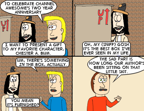 Still, I had this comic in my head after a skit where Chester A. Bum decides to sue Fox for stealing one of his jokes in a Bum Review. What was he suing for? A furnished box. (This sent his lawyer away. Unlike most of the homeless in this country, Chester loves his life as a bum. He’s also rather high on a regular basis.) So if I’m not going to do the Channel Awesome comic, I figured the 2-Year anniversary is as good a place as any to use this joke.