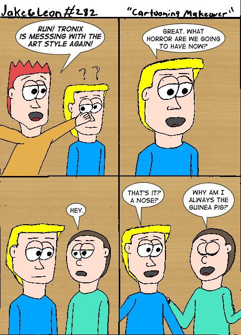 One thing that’s always bothered me about this art style is that the heads never felt quite right. When I first tried this style I had a smaller nose for the character. Then when I started the strip it seemed odd that the nose was so much smaller than the eyes, but by enlarging the nose did the heads not shape right? This is an answer to pose to my readers. I wonder if anyone will respond?