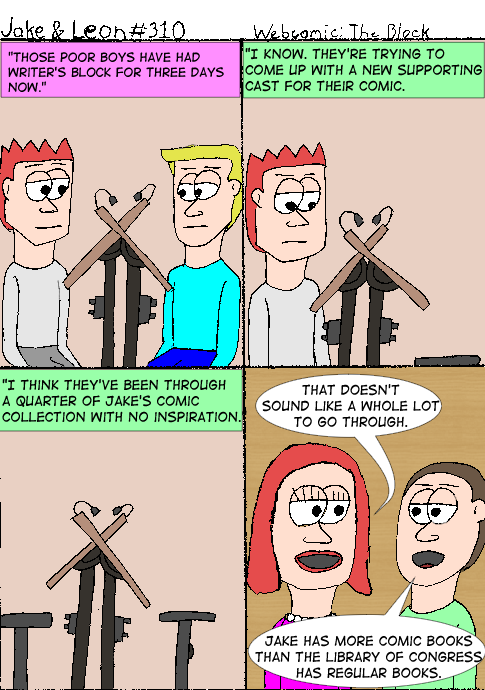 Ah, writer’s block, the curse many a writer has faced. Like when you have two ideas for a webcomic where two of your characters are trying to make a webcomic and you can’t figure out where the gag is. Not that I know what that feels like of course. 🙂