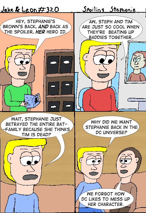 This one’s been stirring in me for awhile, if only because I see Tim reading her the riot act she deserves once he comes back and sees the lengths Steph went through to force her friends out of the superhero game. I know she was also being manipulated by a group doing the tired old “if it weren’t for the heroes we would be safe from their now totally unopposed villains” cliche or “if not of the hero stopping us we wouldn’t be doing the evil acts” lie cliche, but that just makes it worse. She should be smarter than that, no matter what grief she’s feeling believing Tim is dead. She attacks her friends, threaten to expose Batman, and I just wanted to smack her one, which isn’t the reaction I want to have! Between Roy Harper’s reaction to Lian’s death and Stephanie’s reaction to Tim’s faked death I don’t think DC knows how to handle grieving heroes.