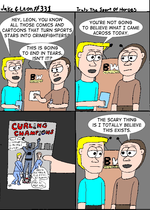 Here’s an example of a comic that went in a different direction than I originally laid out but still with the same theme. This started out with Jake and Leon watching TV and seeing an ad for a new show with the Major League Baseball mascots as superheroes. And why not? Both the NBA and NFL have tried to make heroes out of their players or just the concept with original characters. NASCAR has made an attempt or two of their own to set a story around their sport, even one in the future. So I totally believe some curling promotion will try this in the future if they haven’t already.