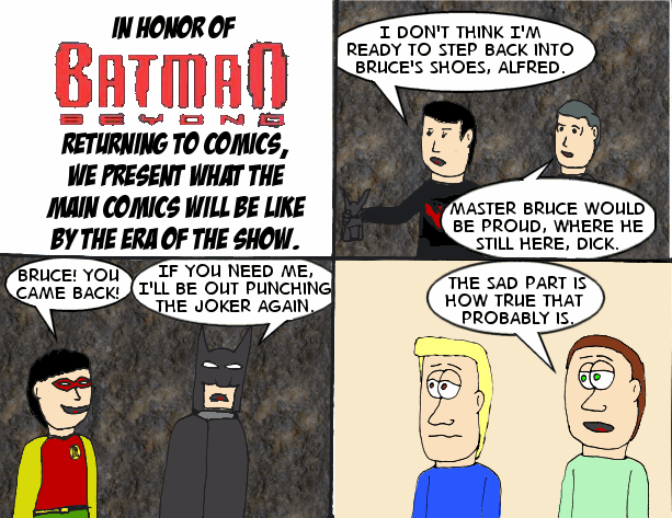I thinking that next time I do a Leon perspective I may use the coloring pencils. Since it’s based on doodles, Leon not being an artist like Jake, it would make more sense than computer coloring. Also not sure if using textures for the Batcave wall works or not based on that concept.