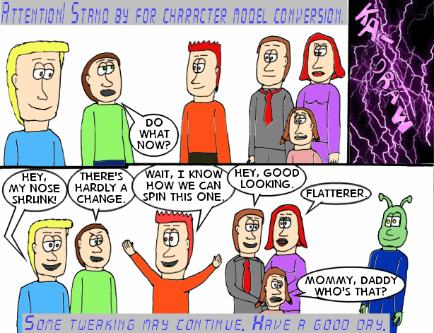 I really haven’t been happy with the past few comics. Recently I figured out what it was. The noses were too long, my attempt to adjust for the oversized eyes that is part of the style, but the end result was that the heads were too long. If you’ve seen the original version of the character models for Jake & Leon for example, you’ll notice a difference. Check my second Progress Report article.