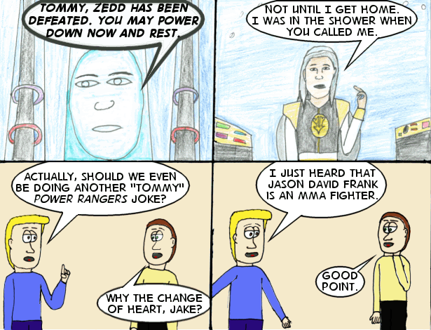 I also went with blue rather than black for the wall so you could make out Tommy’s White Ranger vest. I’m thinking for future Ranger parody strips I’m going to try to go season by season, so the next one may involve something Ninja Ranger Power style.