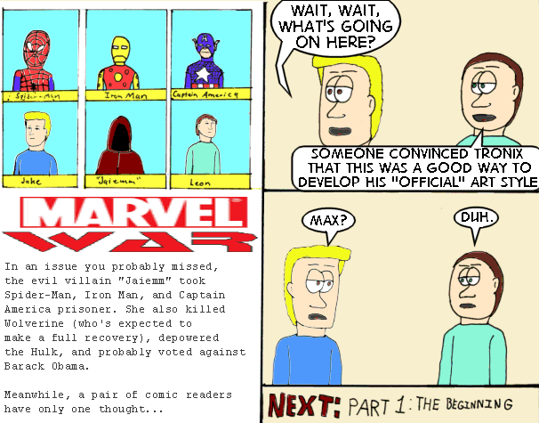 The problem now isn’t so much the look as the colors, which is where this storyline will come in. This isn’t in either “Jake’s” or “Leon’s” perspective. This is all me, with the story taking the first three panels and the boys commenting, much like any other parody I’ve done.