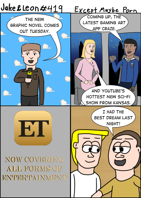 A friend of mine brought up it would be nice to see Entertainment Tonight and other entertainment news shows talk about more than TV and movies, and I figured he was right. That’s just TV & movies tonight. What about video games, comics, novels that aren’t currently being turned into movies? Why do they get no love? So Leon dreamed a world where it was so. I’m using that to explain why the fashions are terrible because I have no sense of fashion whatsoever!