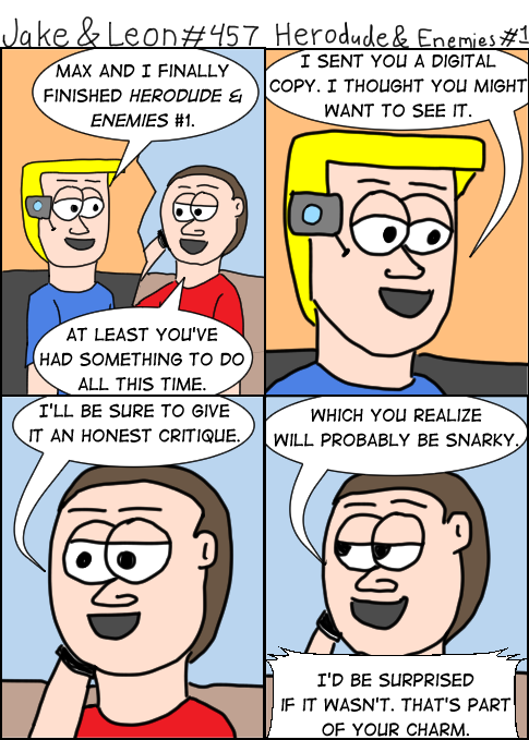 I was getting tired of only talking about the Covid-19 pandemic and shutdown plus the riots that stopped being about George Floyd pretty much when they started. I’d been wanting to do something with that Herodude & Enemies idea but I kept having other things to talk about. Since the entertainment industry isn’t having the prefered brand of stupidity for a discussion topic it’s been difficult. So I finally opted to give this Herodude story idea a push through. It works similar to the “Marvel Wars” arc I did some years ago: three panels of the comic Jake and Max worked on, with the fourth panel Leon commenting on it, because I still have the “each comic must star at least one of the title characters” rule. (It bugs me when comic strips go whole weeks without the title character at least being a small part of the story, even if it fleshes out someone in the supporting cast.)