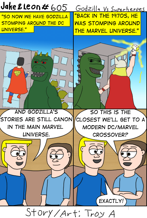 I went with Superman and Thor because their capes covered up a lot, cutting the time needed to draw them. Of course, since both are among the most powerful beings of their universe and neither could stop Godzilla it makes sense.