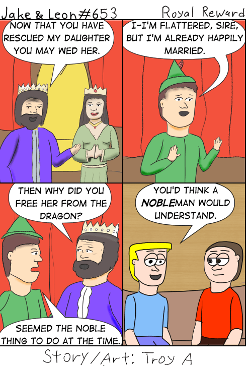 A lot of stories have the hero marrying the princess after rescuing her, but I wondered what would happen if he didn’t want to? I needed an excuse that wouldn’t end in an insult that might get his head removed, so I had him married. Maybe I should have given him a wedding ring but I don’t know when that tradition started, and you’d barely be able to see it on most devices anyway. Also, I forgot.