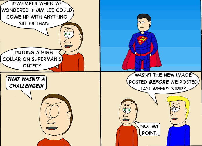 Although to be fair the boots in the latest pic weren’t that horrible. Still, the plating look is actually sillier than the high collar on characters not dressed as Batman. As one of my Twitter followers pointed out, why does he need armor? He’s Superman? Well, I suppose it could last longer than his usual spandex, which in the past has been explained away as either a mild force field or Kryptonian fabric that was in the ship. (One variation that it was his baby blanket, although it must be one big blanket. Clark’s glasses were also supposed to use the glass from the ship, explaining how he can use his heat vision while wearing them.)