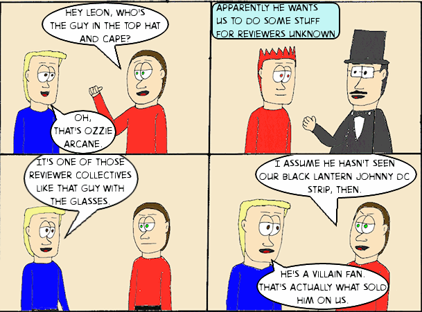 No, really, Ozzie Arcane’s character in his videos is that of a failed supervillain. (Is there any other kind? Not in my stuff.) This comic was to announce that I would be joining the website Reviewers Unknown, a reviewer collective not unlike the more famous That Guy With The Glasses.com. I’m mostly reformatting old articles for RU, although I may add new articles and my video articles depending on my schedule. It should increase my exposure, which means more readers.