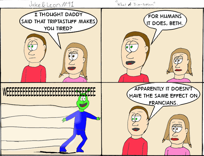 In Alien Nation the Tenctonese (or newcomers) can become intoxicated by drinking spoiled milk like humans do fermented fruit or alcohol. I didn’t actually have that in mind when I decided tryptophan works differently in Fizzbin’s people but there is a precedence for the joke.